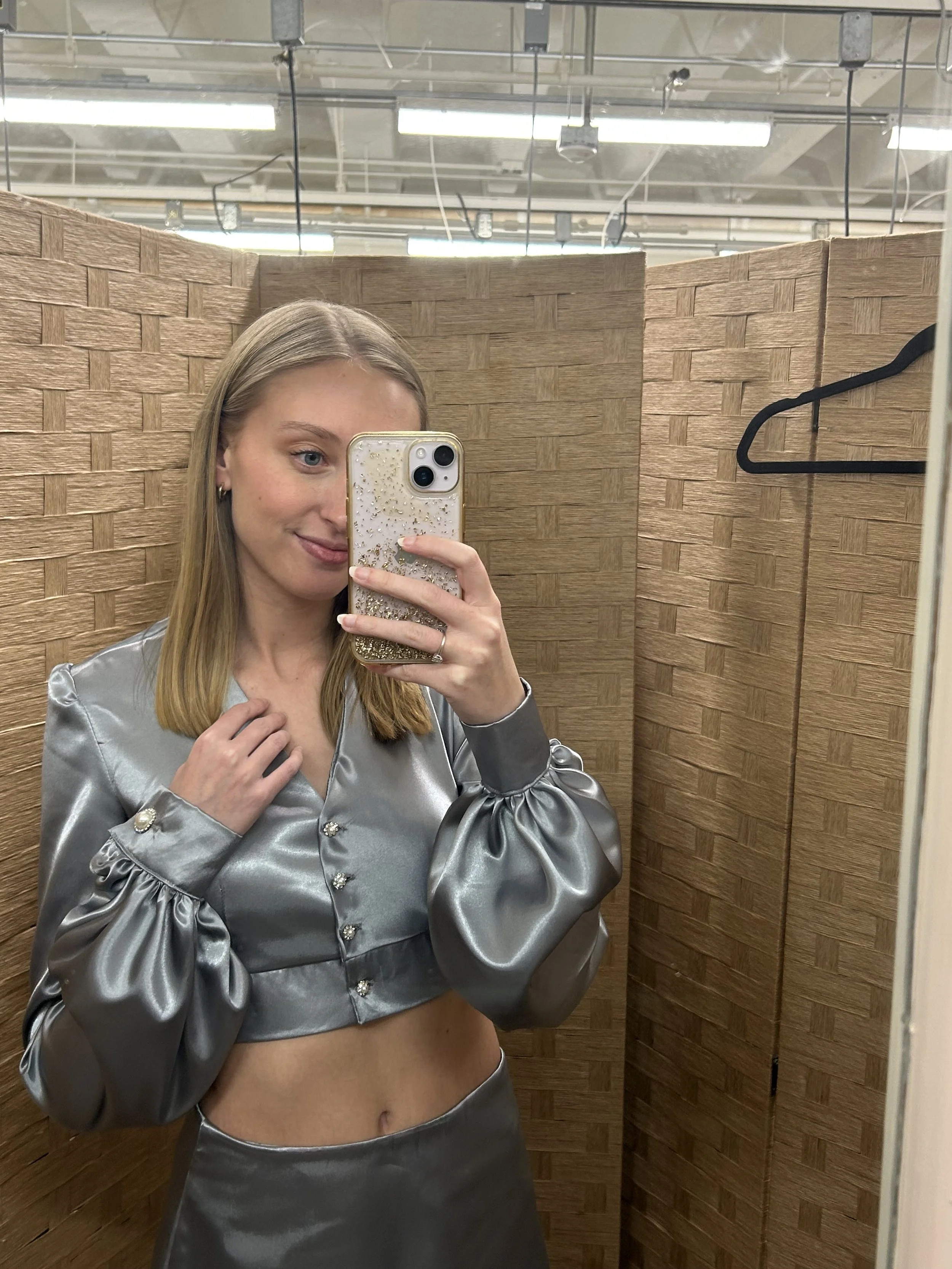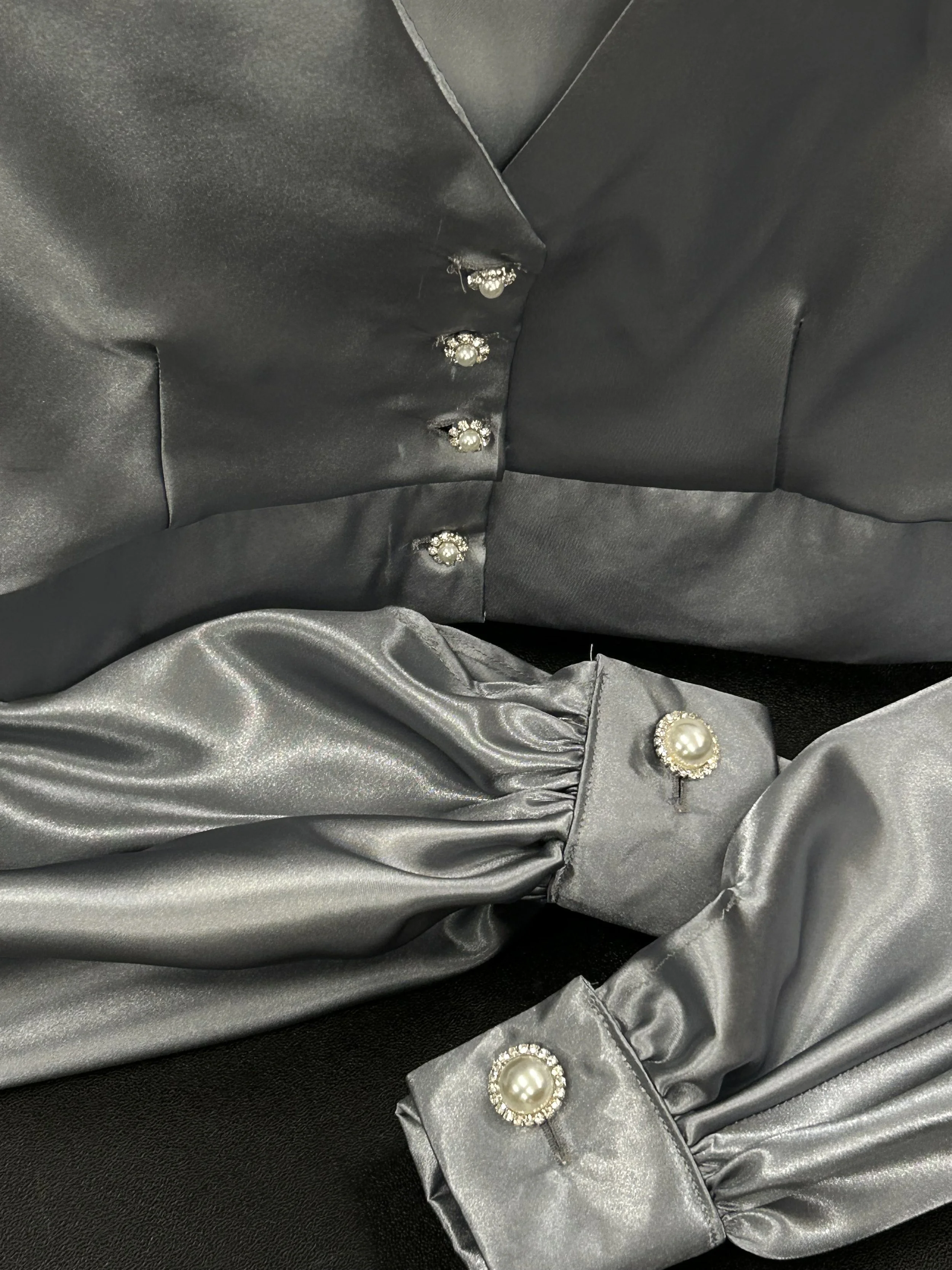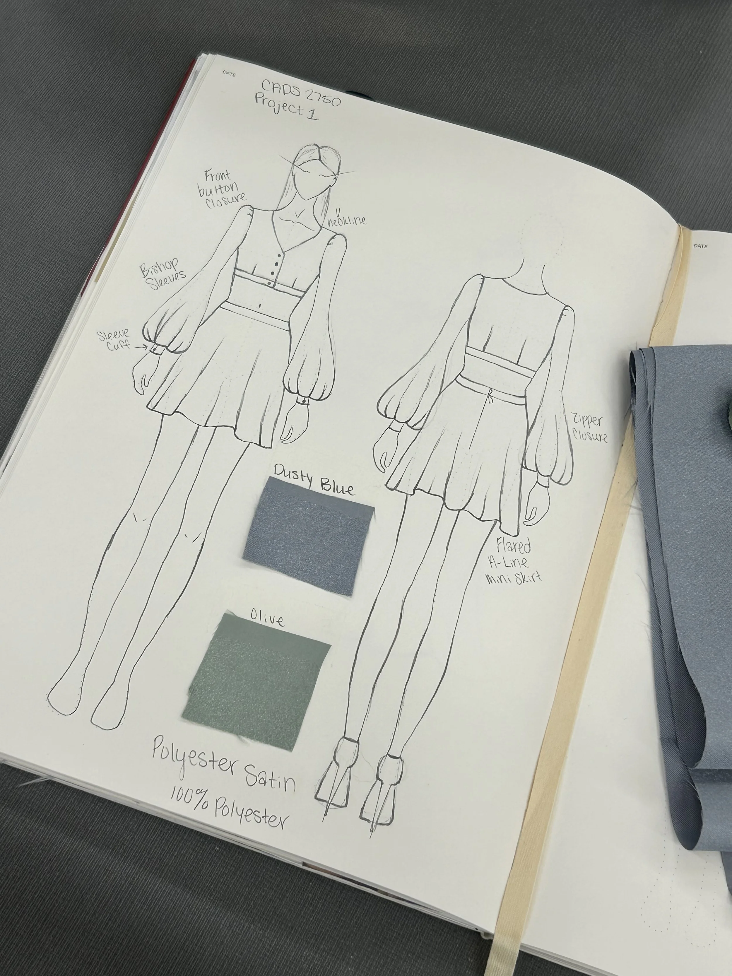 This is the Top and Skirt I designed for my Technical Design class. I have a lot of love for this look because this it the first design I made from sketch to final completion. The top includes bishop sleeves and cuffs with button closures. It also includes a v-neckline, and buttons down the center front. The skirt is an a-line skirt with a zipper down the center back.